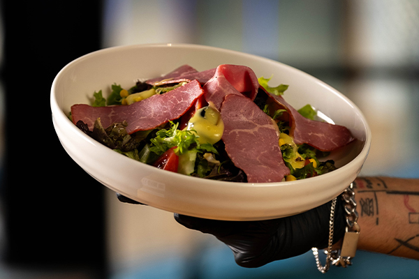 Akdeniz yeşillikleri, acılı köz patlıcan, hellim peyniri, hindi füme, salatalık, mısır, çeri domates, salata sosu ile