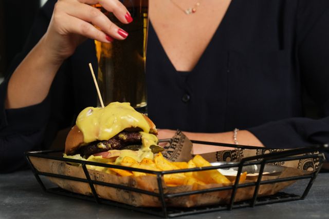 Cheddar, karamelize soğan, turşu, hamburger köftesi