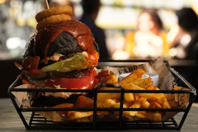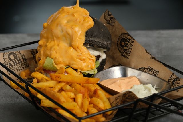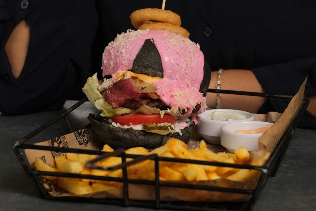 Kırmızı özel sos, marul, domates, beetroot dip sos, cheddar, burger köftesi, siyah burger ekmeği, ananas