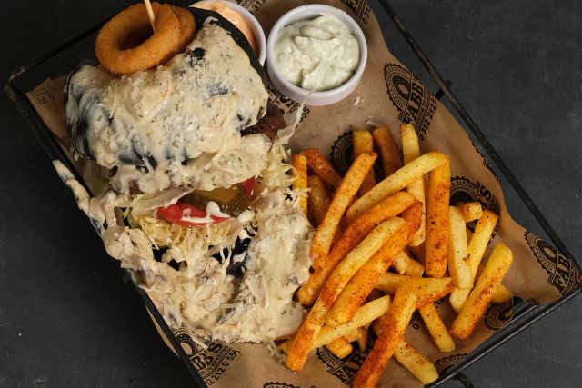 120 gr çıtır tavuk, ABBS Sos, Acı tatlı Sos, Closlaw, karamelize soğan, pesto soslu mısır
