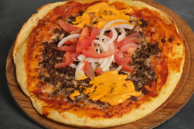 Pizza sosu, Mozzarella, özel çekim kıyma, cheddar peyniri, domates, soğan