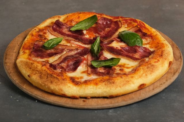 Pizza sos, dana füme, domates, fesleğen, parmesan
