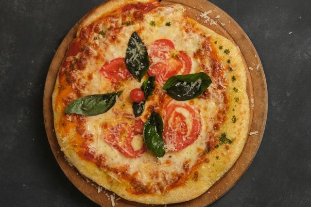 Pizza sos, Mozzarella peyniri, domates, fesleğen, parmesan