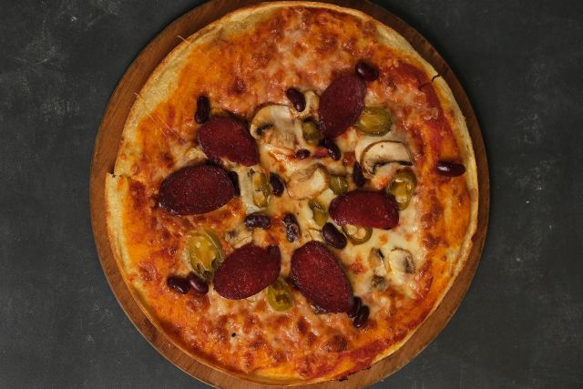 Pizza sos, sucuk, jalepeno, Mozzarella, meksika fasulyesi, mantar