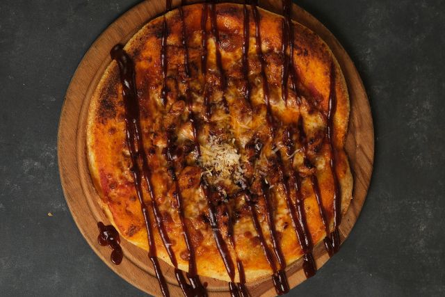 Pizza sosu, ananas, jalepeno biberi, Mozzarella, barbekü sos, sucuk
