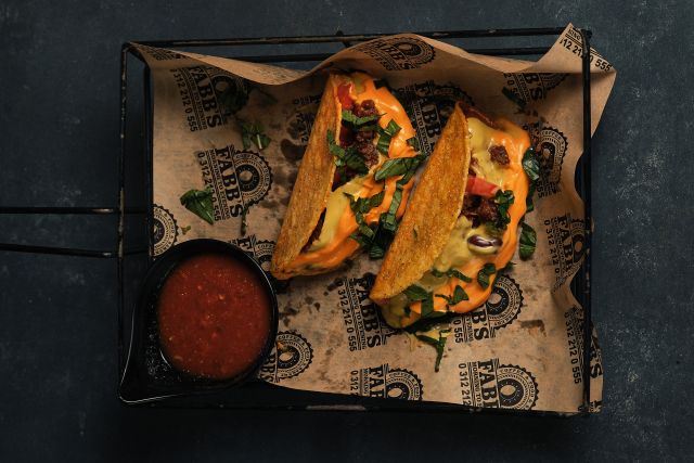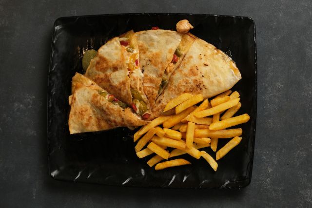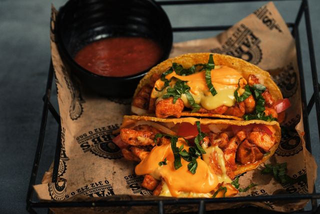 Satır tavuk, mix biber, tacos sos, cheddar, rende kaşar, mantar, meksika fasulyesi, tortilla ekmeği