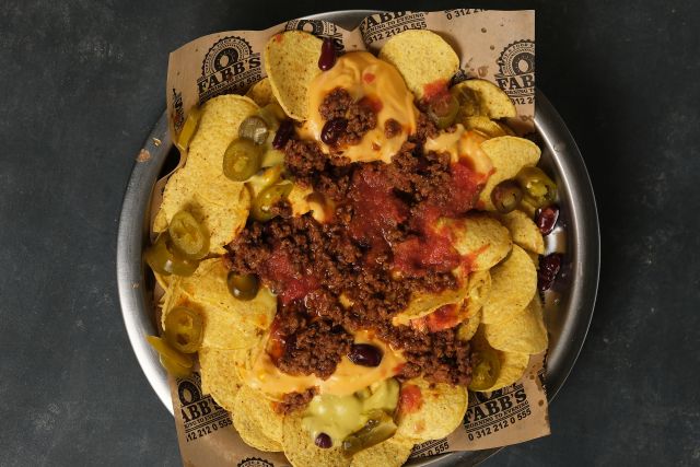 Kıyma tachos soslu, salsa, guacamole avokado, cheddar küpleri, chipotle sos, jalapeno, maydanoz, soğan