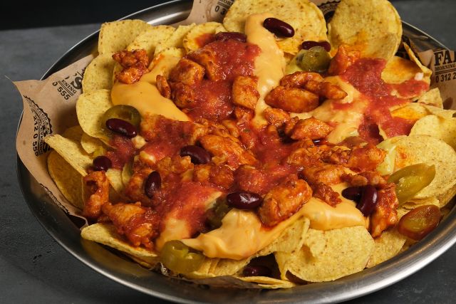 Tavuk tachos soslu, salsa, guacamole avokado, cheddar sos, chipotle sos, jalapeno, maydanoz, meksika fasulyesi